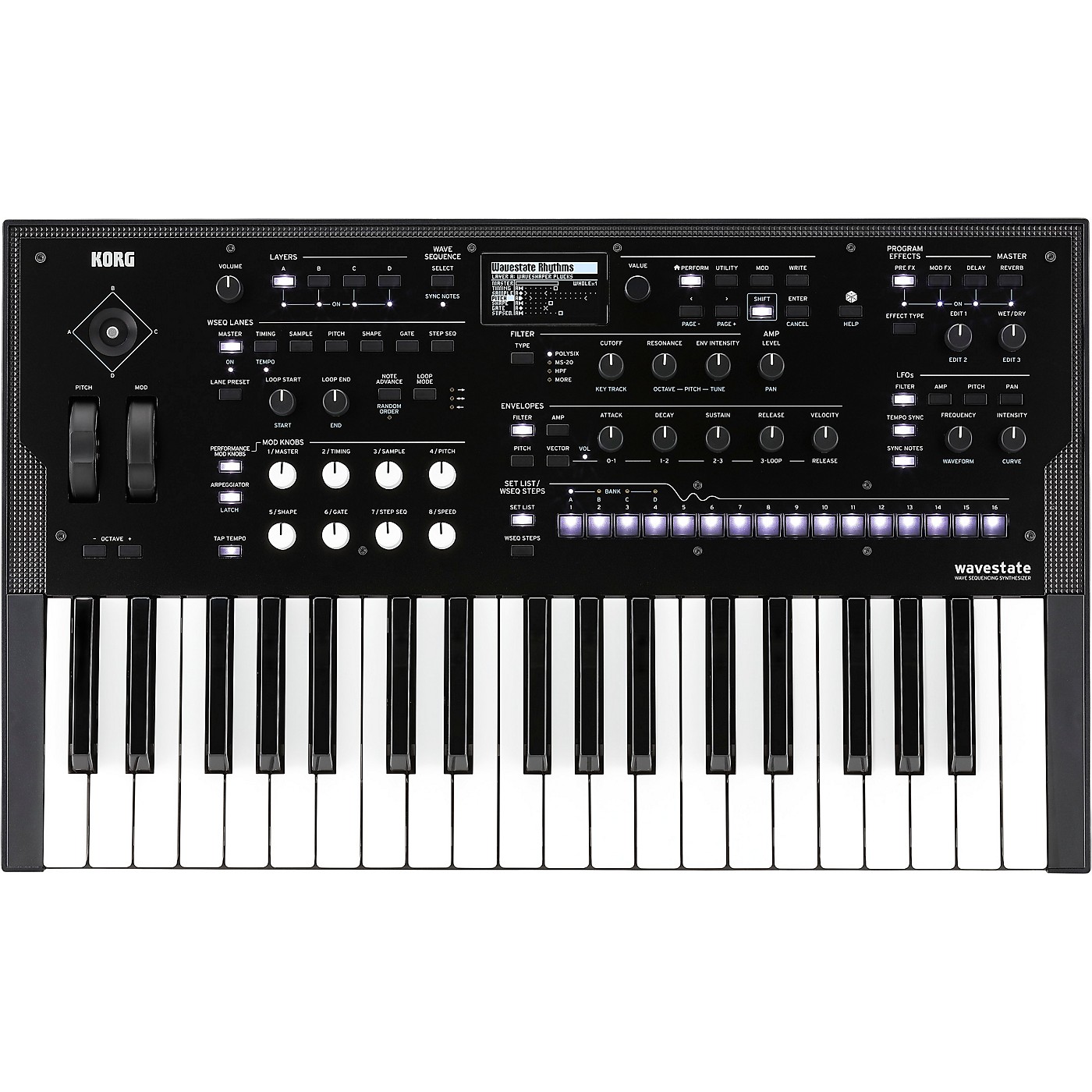 KORG’s legendary Wavestation introduced the world to Wave Sequencing, transforming raw samples into sounds that no-one had ever heard before. The flagship OASYS and KRONOS keyboards developed Wave Sequencing even further, expanding on its unique palette of lush, evolving pads and driving rhythms.Now, KORG is proud to announce the next step in digital synthesis: the wavestate. Featuring the radically re-imagined Wave Sequencing 2.0, the wavestate delivers astonishing, ever-changing sounds with extensive hands-on control.Far from a nostalgic reissue, the wavestate is designed from the ground up for a new generation of musicians, producers, and composers, taking cues from sources as diverse as modular synths, groove boxes, and algorithmic composition. The compact form-factor, with 37 full-size keys, transports easily and fits neatly into any stage, studio, or desktop setup. Wave Sequencing 2.0With the Wavestation, each step of a Wave Sequence had a duration, a sample, and a pitch. This created ear-catching patterns–but the patterns repeated the same way, over and over.What if they could evolve in organic, unexpected ways, instead of just repeating?Wave Sequencing 2.0 splits apart the timing, the sequence of samples, and the melody, so that each can be manipulated independently. Also added are new characteristics including shapes, gate times, and step sequencer values. Each of these is a “Lane,” and each Lane can have a different number of steps and its own start, end, and loop points.Every time the sequence moves forward, the individual Lanes are combined to create the output. For instance, a sample may be matched with a different duration, pitch, shape, gate length, and step sequence value every time that it plays. You can modulate each Lane’s start, end, and loop points separately for every note, using velocity, LFOs, envelopes, Mod Knobs, or other controllers. Each note in a chord can be playing something different!Lanes can also randomize the step order every time they play, with realtime control over the range of included steps. Finally, individual steps can be randomly skipped, with a modulatable probability from 0 to 100%. The result is organic, ever-changing sounds that respond to your control. The four onboard arpeggiators can interact with Wave Sequences for even more possibilities.Easily expressive. Exceptionally deep.Bursting with knobs and controllers, the wavestate invites you to explore. All of the basics–filter, envelopes, LFOs, effects–are at your fingertips with dedicated front-panel controls. Eight programmable Mod Knobs are customized to bring out the most in every sound, often taking them in entirely new directions. Use the knobs in realtime performance, and also save the results as new sounds. Add in the Pitch Bend and Modulation Wheels and the unique Vector Joystick, and you’ll always have multiple dimensions of realtime expression.Want to dig deeper? Almost all front-panel knobs, and most on-screen parameters, can be modulated. You can even modulate settings for individual Wave Sequence Steps! Mod Processors let you transform modulation signals using quantization, smoothing, curvature, and more. Randomization that inspires.Looking for even more inspiration? A dedicated front-panel button, marked by a “dice” icon, generates new sounds via intelligent randomization. Randomize the entire sound or just a part of it, such as the filter, the Sample Lane, or the effects. Use the results directly, or as a jumping-off point for your own creations. Ample samples. 64 stereo voices.Totaling in the gigabytes, the wavestate’s sample library is more than a thousand times larger than that of the original Wavestation. That’s a lot of great-sounding raw material for Wave Sequences. There’s a bank of samples from Plugin Guru, brand-new samples from KORG, and a selection from the Kronos and Krome libraries. Of course, KORG also provides all of the Wavestation’s samples (including all options), plus a huge library of Wavestation Wave Sequences. Play up to 64 stereo voices with pristine clarity, using KORG’s proprietary anti-aliasing sample playback technology.Choose your filter. Add vintage character to your sounds with the aggressive MS-20 Lowpass or Highpass filters, or the strong, sweet Polysix Lowpass. Shape and refine with a full collection of resonant 2-pole and 4-pole Lowpass, Highpass, Bandpass, and Band Reject filters. Or, step outside the box with KORG’s unique Multi Filter, which creates modulatable blends of multiple modes simultaneously.Multiply by four.With all of that synthesis power, you might think the wavestate would play only one sound at a time. Not a chance. For even more rich and complex results, layer up to four Programs together in a Performance–each with their own effects and arpeggiator. The Vector Envelope and Joystick mix the individual voices of the four Layers, and can also modulate any other parameters.An arsenal of effects.The wavestate’s superb effects deliver production-ready sounds. Each Layer has three dedicated effects; additionally, the Performance has a master reverb and parametric EQ. Along with standards such as compressors, EQs, choruses, flangers, phasers, and stereo delays, you’ll find distinctive processors such as the Wave Shaper, Talking Modulator, Reverse Delay, Multiband Mod Delay, and Overb (from the OASYS), plus modeled effects including VOX guitar amps, VOX wah, multi-head tape echo, and a collection of classic guitar pedals.Set Lists and Smooth Sound Transitions.Set Lists offer effortless organization of your wavestate Performances, and deliver instant access at the gig or in rehearsal. Smooth Sound Transitions allow previously-played voices and effects to continue to ring out naturally, even once a new sound has been selected.Plays well with others.Balanced stereo outputs connect to any recording or monitoring system, and a stereo headphone output is provided for private playing or onstage cueing.