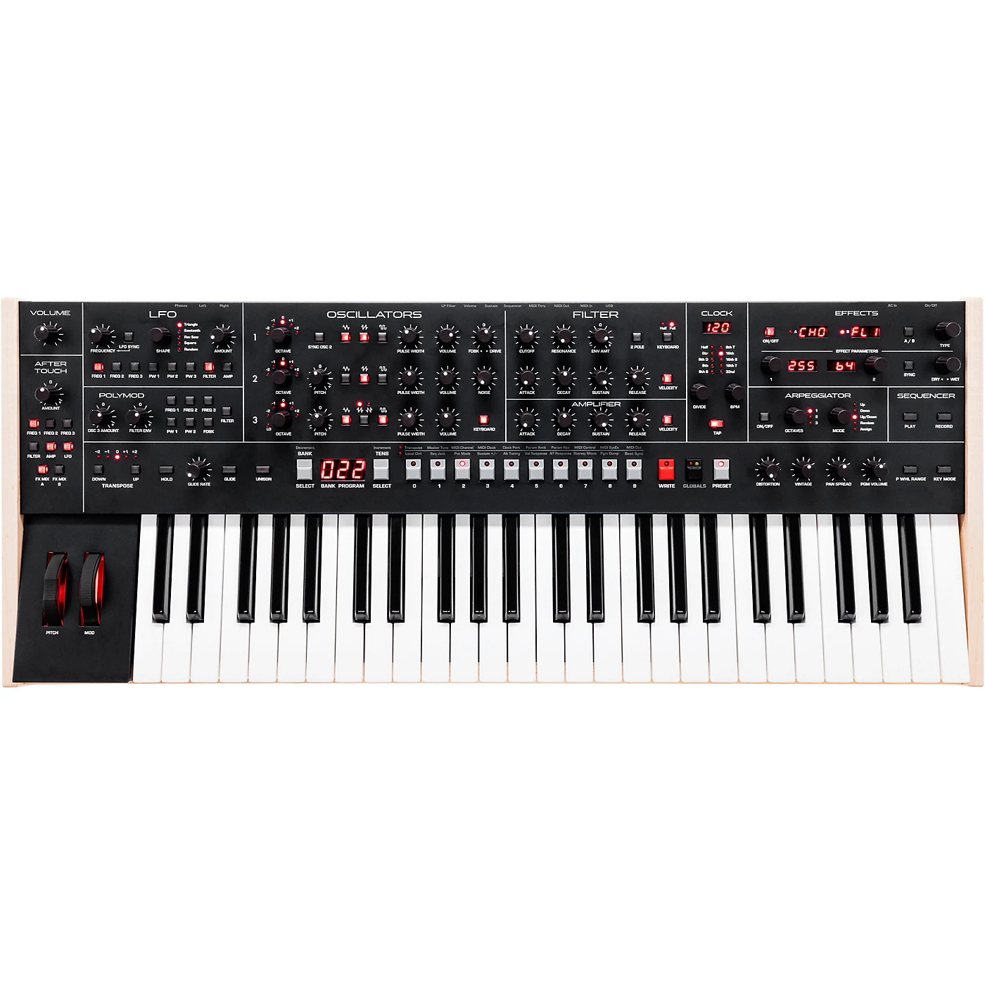 Also present is Sequential’s classic Poly Mod, with enhancements for creative sound design. Modulation sources are filter envelope and oscillator 3 (both with bi-polar control). Destinations include oscillator 1, 2 and 3 frequency, oscillator 1, 2 and 3 pulse width, filter cutoff and feedback. Unison mode is here as well, featuring configurable voice count (one to six voices for up to 18 simultaneous oscillators) and key modes.