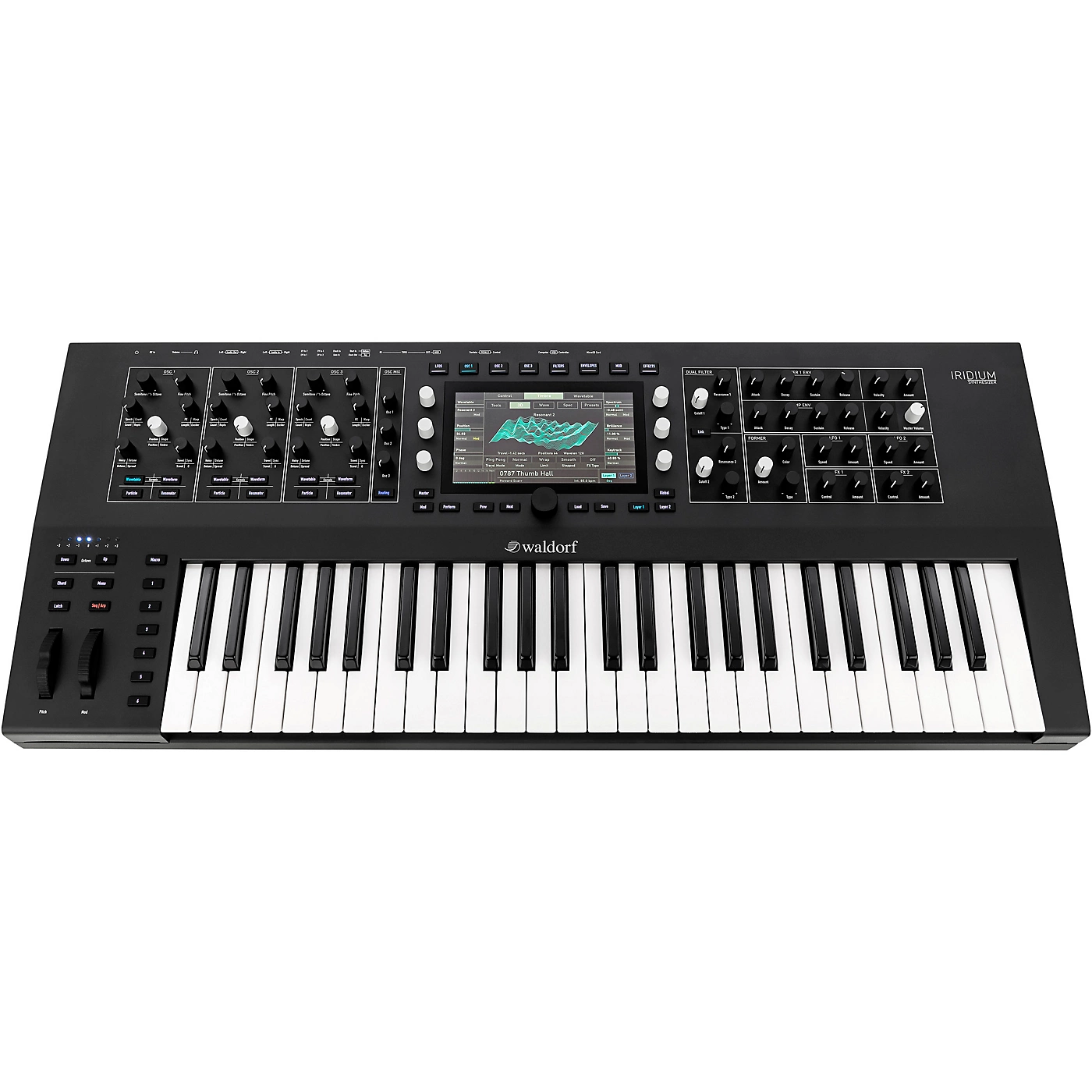The jaw-dropping sound and power of the Waldorf Iridium Desktop Synthesizer are now available in a rock-solid, incredible-feeling 49-key instrument with polyphonic aftertouch. Explore 1,680 unique sounds and textures, save thousands of your own customizations and swap sounds with Iridium Desktop or the flagship Quantum Synthesizer. Explore the depths of wavetable, analog modeling, granular synthesis and more via Iridium’s gorgeous color touch screen and comprehensive knob-per-function surface. Alongside fantastically expressive keyboard action, the Iridium Keyboard offers an expanded front panel with one-knob-per-function control as a workflow-raising result of this high-class synthesizer’s palpable physical makeover, also allowing for six freely programmable Macro buttons with which users can define functions from a wide range of features for additional performance control. The FATAR TP/8SK keyboard features polyphonic aftertouch and three contacts per key for new levels of response and playability. Best of all, tremendous tonal changes flow freely when playing the Iridium Keyboard live since polyphonic aftertouch is transmitted individually for each note played. Performers can conceivably play and hold down any number of keys simultaneously, subsequently moving each finger individually.
