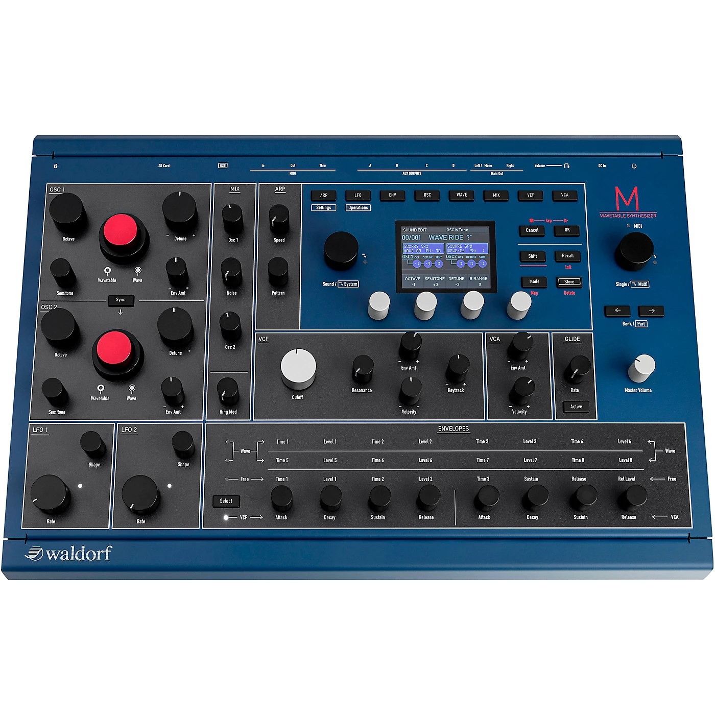 The Waldorf M synthesizer is a wavetable synthesizer that evokes and expands upon the legendary Waldorf Microwave I and II in a powerful, modern, hybrid desktop synth. Featuring an analogue lowpass 24 dB/Oct VCF with an analogue saturation feature, true stereo analoge VCA with panning option and much more. Explore your musical creativity in a desktop-friendly form factor featuring a wide range of settings and unique sounds. The Waldorf M is packed with 2,048 sound programs divided into 16 banks, each with 128 sounds professionally programmed by world renowned sound designers. These include all of the classic Microwave sound sets, such as MW1 Factory Sound Set, MW1 Soundpool 1-5, the fat-sounding Analog and Bassco, as well as PPG Wave 2.3 sounds cleverly converted for the original Microwave.Two LFOs, each generate a periodic waveform with adjustable frequency Rate and Shape can be used for modulation purposes. However, unlike other Waldorf synthesizers, there is no modulation matrix in M. This unit again pays tribute to vintage Microwave models with modulation facilities set up directly on the corresponding display page. This Waldorf M synthesizer takes performance to a whole new level, thanks to an advanced ARP with 16 preset patterns, chord mode and an ability to synchronize to a MIDI clock. Plus, four programmable Envelopes allow for adventurous users to manipulate sound parameters via rate or timed modulations.
